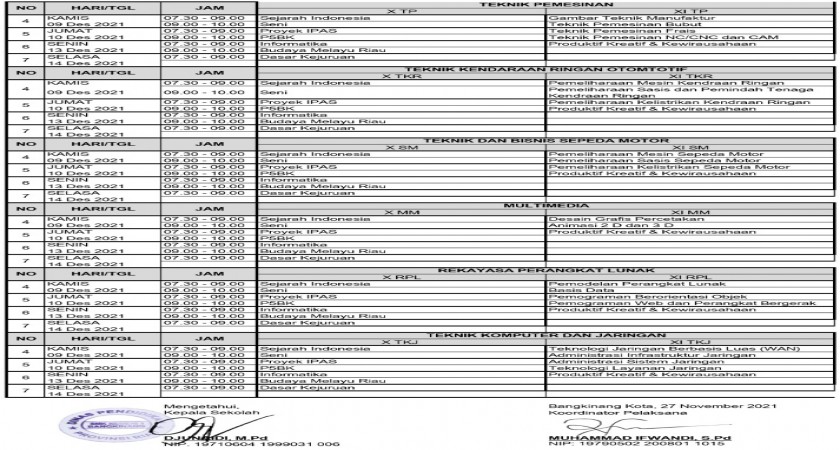 Penilaian Akhir Semester 1 Tahun Pelajaran 2021/2022 kelas X (sepuluh) dan XI (Sebelas) Dilaksanakan tanggal 06 Desember 2021 dan penerimaan raport/ tanggal raport 23 Desember 202